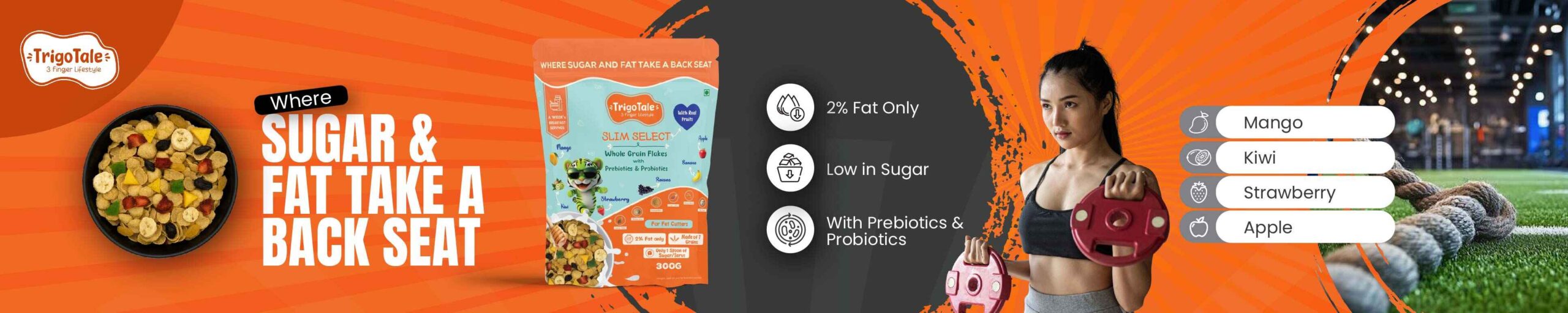 TrigoTale Slim Select Flakes | Low Fat Breakfast Cereals, Only 2% Fat, Only 1 Spoon of Sugar Per Serve | Prebiotics & Probiotics | Made of 7-Grains | Real Fruits - (300g x 2 + 50g Honey Pack Inside)