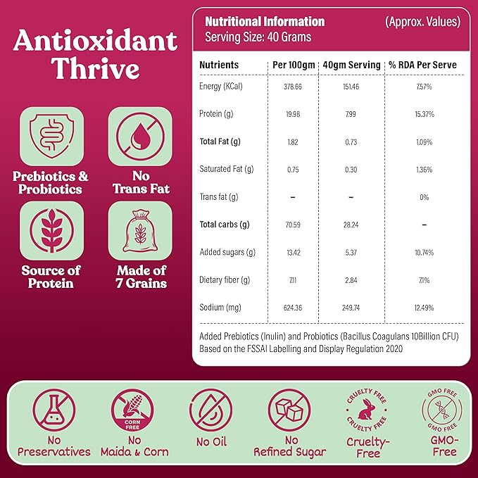 TrigoTale Antioxidant Thrive is more than just a cereal—it’s a functional food. Prebiotics (inulin) nourish beneficial gut bacteria, while probiotics (Bacillus Coagulans 10 Billion CFU) introduce live cultures that help maintain a balanced microbiome. Together, they support improved digestion, nutrient absorption, and overall gut health, which can enhance immunity and overall well-being.