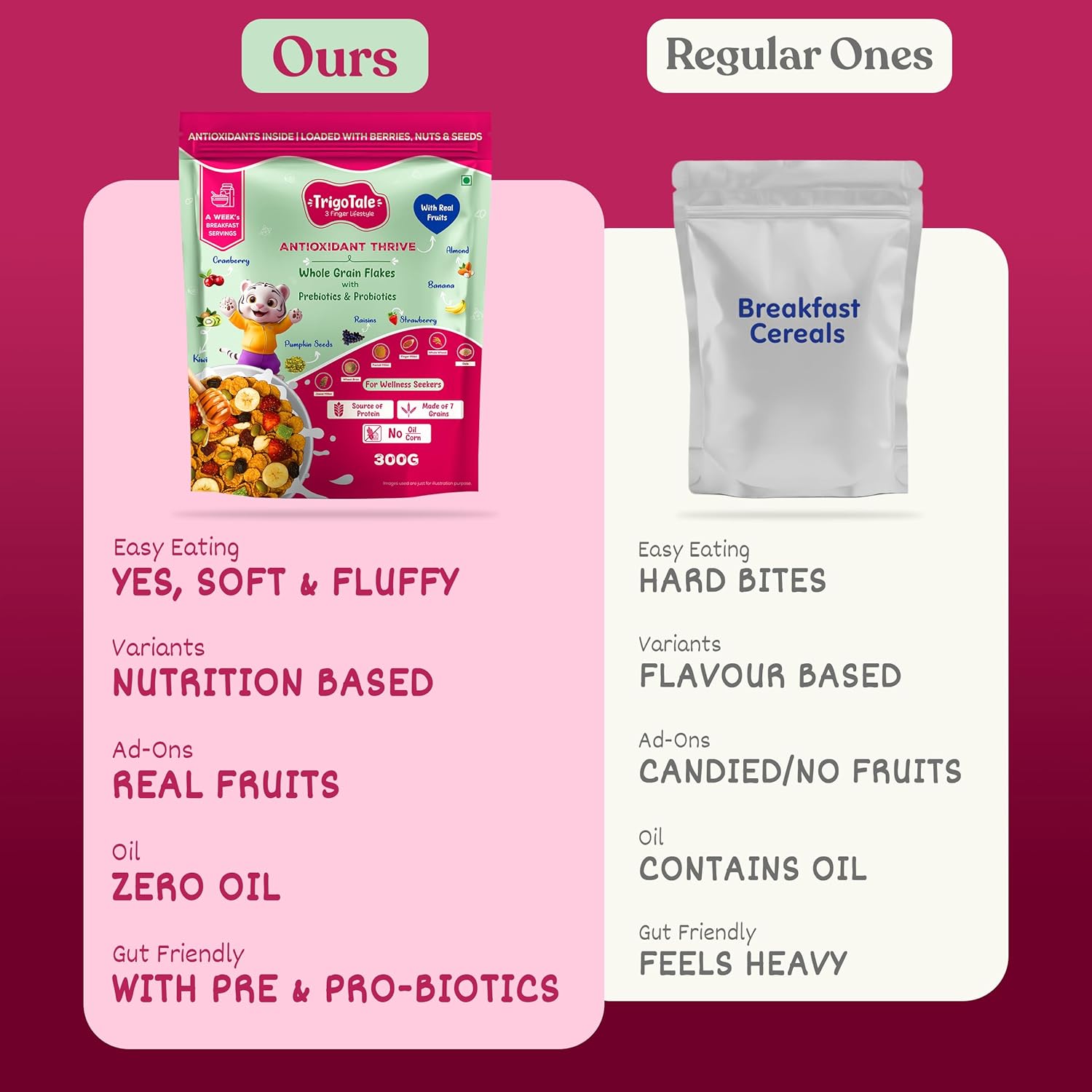 Step into a new era of breakfast with TrigoTale Antioxidant Thrive—a nutrient-dense, antioxidant-rich cereal designed for those who want more from their morning meal. This ready-to-eat breakfast cereal is a true multigrain powerhouse, combining the benefits of seven whole grains, real fruit and nut add-ons, and scientifically chosen ingredients to support your heart, gut, and overall vitality.