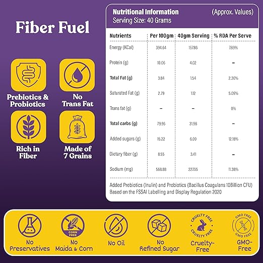 This breakfast cereal is high in fiber from 7 grains and bran, supporting gut health and helping you feel full longer. It features a probiotic and prebiotic blend that enhances digestion and nutrient absorption, while being naturally sweetened with jaggery for clean energy. Real fruits, nuts, and seeds add crunch, flavour, and extra nutrition. With no oil, Maida, or preservatives, it’s a clean-label food perfect for modern living. The multigrain blend provides sustained energy and balanced nutrition, and it’s ready in just 3 minutes for a hassle-free breakfast. Resalable packaging keeps your cereal fresh and convenient.